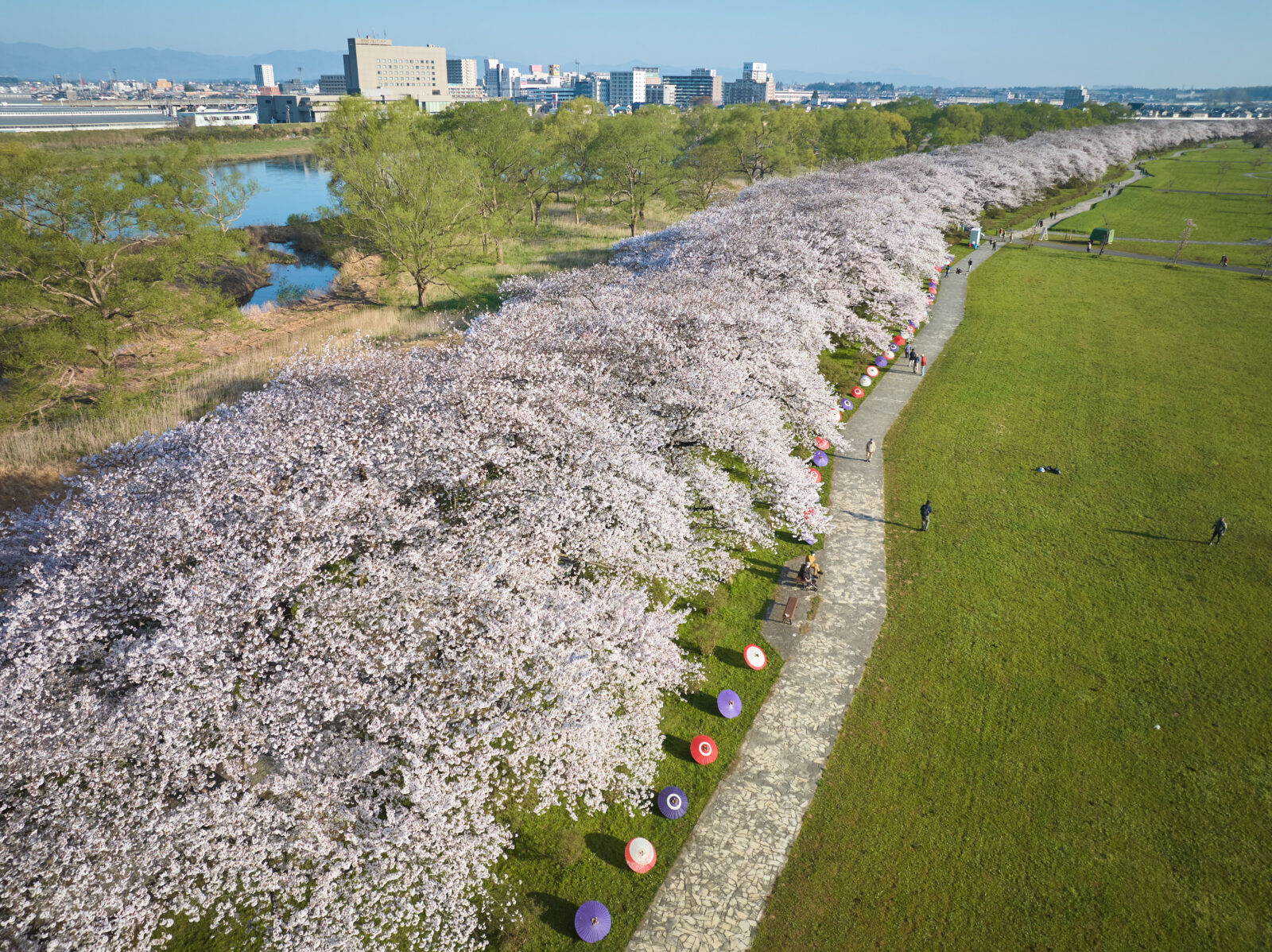 A 2-kilometer tunnel of cherry blossoms stretches along the Kitakami River. When the 10,000 trees are blooming in the park, visitors are enveloped in an arch of flowers swaying in the river breeze. The spacious riverside attracts many picnickers, and viewing the trees from a sightseeing horse-drawn carriage is a popular highlight. The harmony between the flowing river, the distant mountains, and the vast rows of trees creates a sense of openness and exhilaration.