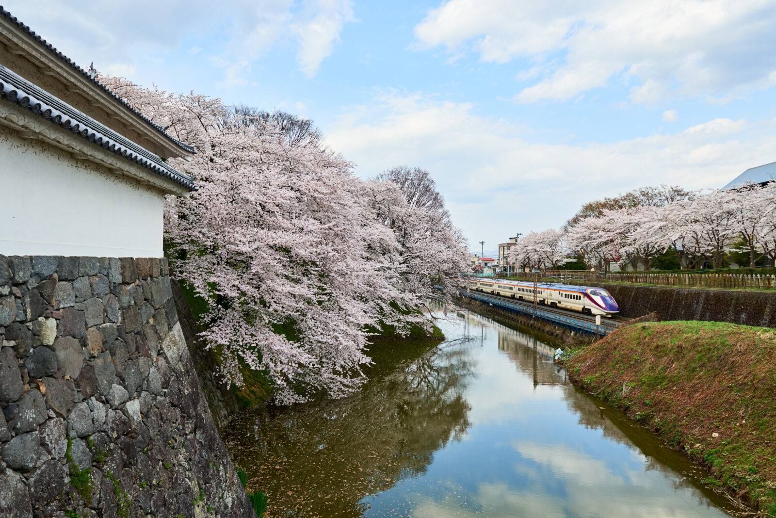 At this park, the entire hillside is transformed into a sea of pink. As you ascend toward the summit via the slope car, the view of blossoms through the windows is breathtaking. From the top, you can enjoy a panoramic spring vista that overlooks both the Shiroishi River cherry trees and the Zao Mountains. The blossoms blooming amidst the historic ruins carry a dignified air, blending festive brilliance with a quiet, noble elegance.