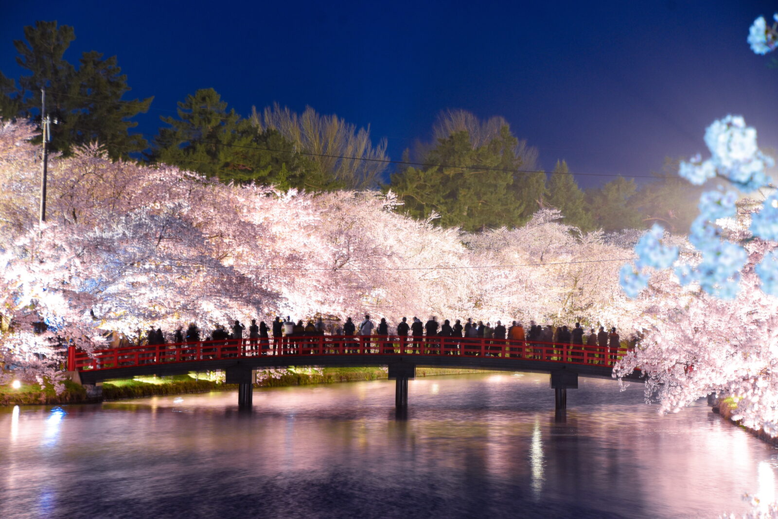 Often called the best cherry blossom site in Tohoku, the park is famous for its “Hana-ikada,” where the outer moat becomes completely carpeted in fallen petals, making even the falling of the blossoms a spectacular sight. With approximately 2,600 trees, the landscape—blending the castle structure with ancient trees—is both grand and elegant. Nighttime illuminations create a dreamlike world, reflecting blossoms on the water’s surface. This is where the late-arriving spring of the north bursts into full, glorious bloom.