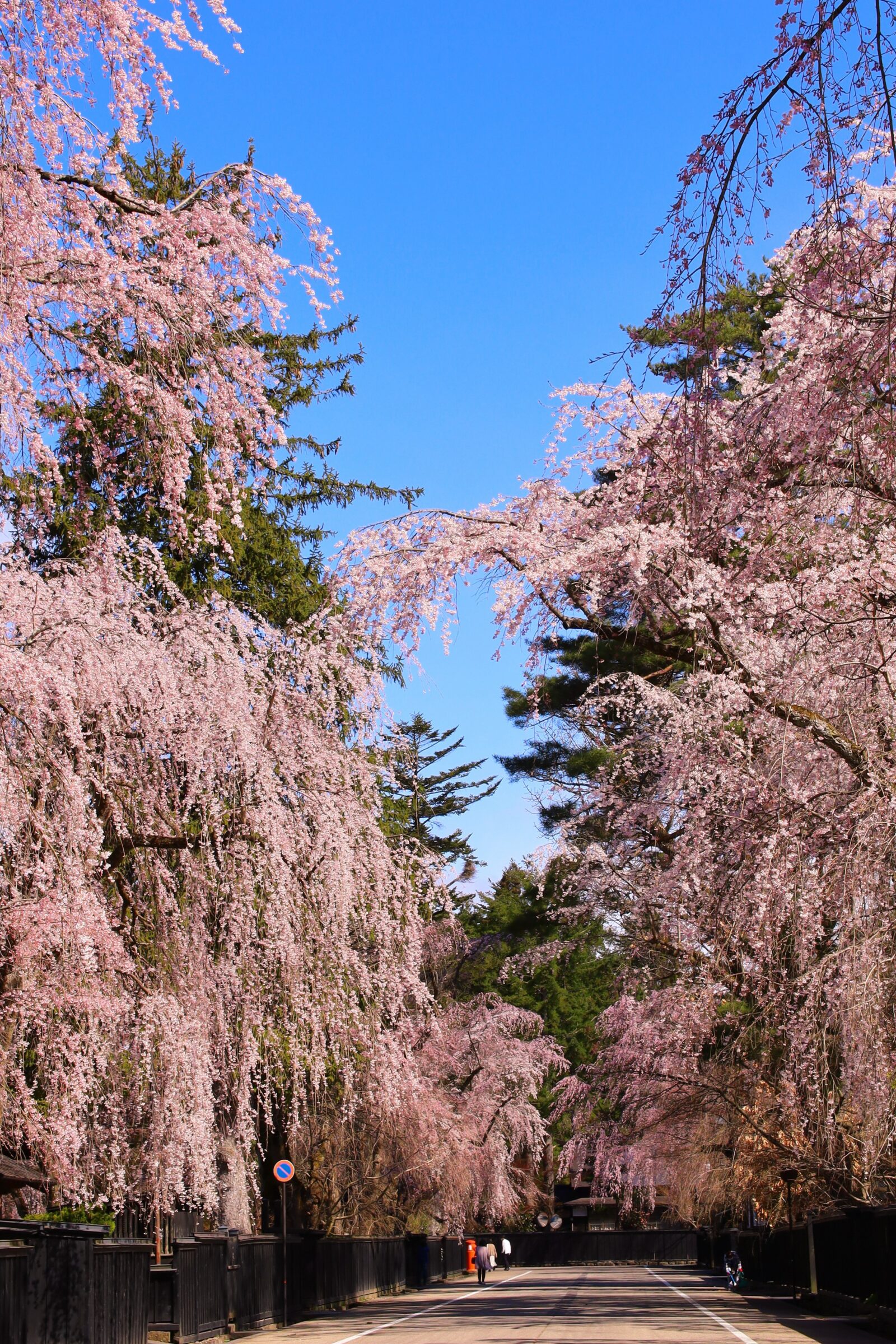 Along the streets lined with historic black-paneled fences, weeping cherry trees drape down with grace. The contrast between the historic samurai residences and the pale pink blossoms makes you feel as though you’ve stepped back in time. The elegant sweep of the aged branches swaying in the spring breeze is exceptional. Visitors can also enjoy the beautiful contrast with the Someiyoshino trees blooming along the Hinokinai River Bank (Hinokinaigawa-tsutsumi). This refined, atmospheric town offers a quintessential Japanese spring experience.