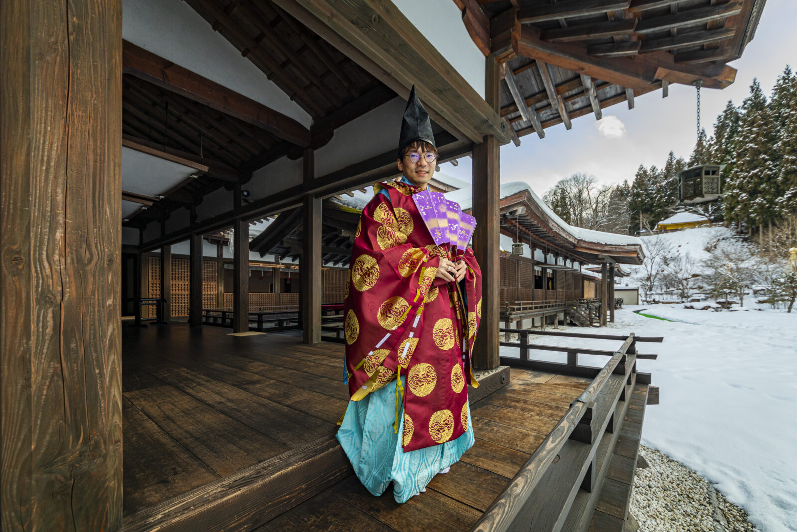Here, I step into a Kariginu—originally hunting attire that evolved into noble daily wear. My outfit is a striking red robe adorned with auspicious cranes, over pale blue trousers. It takes two people to dress me, carefully layering the heavy silk. The weight of the fabric and the sweep of the long sleeves force me to move differently—slower, more deliberately. This physical constraint offers a tangible glimpse into the actual grace and pace of the Heian nobility.