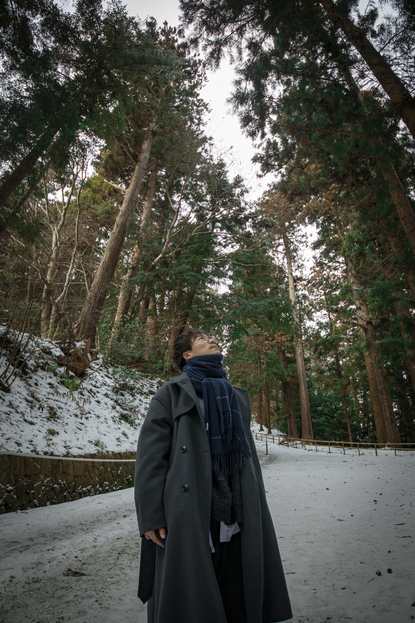 We drive to Chuson-ji as the snow begins to fall heavier. The approach, Tsukimizaka, is lined with towering cedars that seem to welcome pilgrims. The path is slick with snow, demanding mindful steps.
