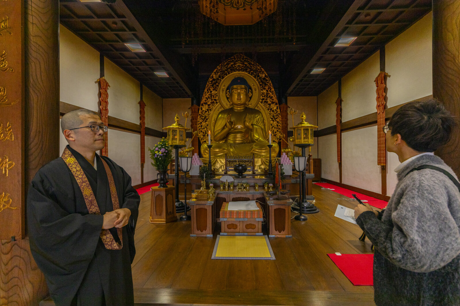 Our first stop is the Main Hall (Hondo). The principal image is a 16-foot Shakyamuni Buddha covered in gold leaf—not to boast of wealth, but to symbolize the light of the Pure Land. What makes this Buddha unique is the hand gesture, or mudra. The right hand faces outward, while the left faces inward.